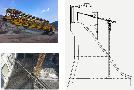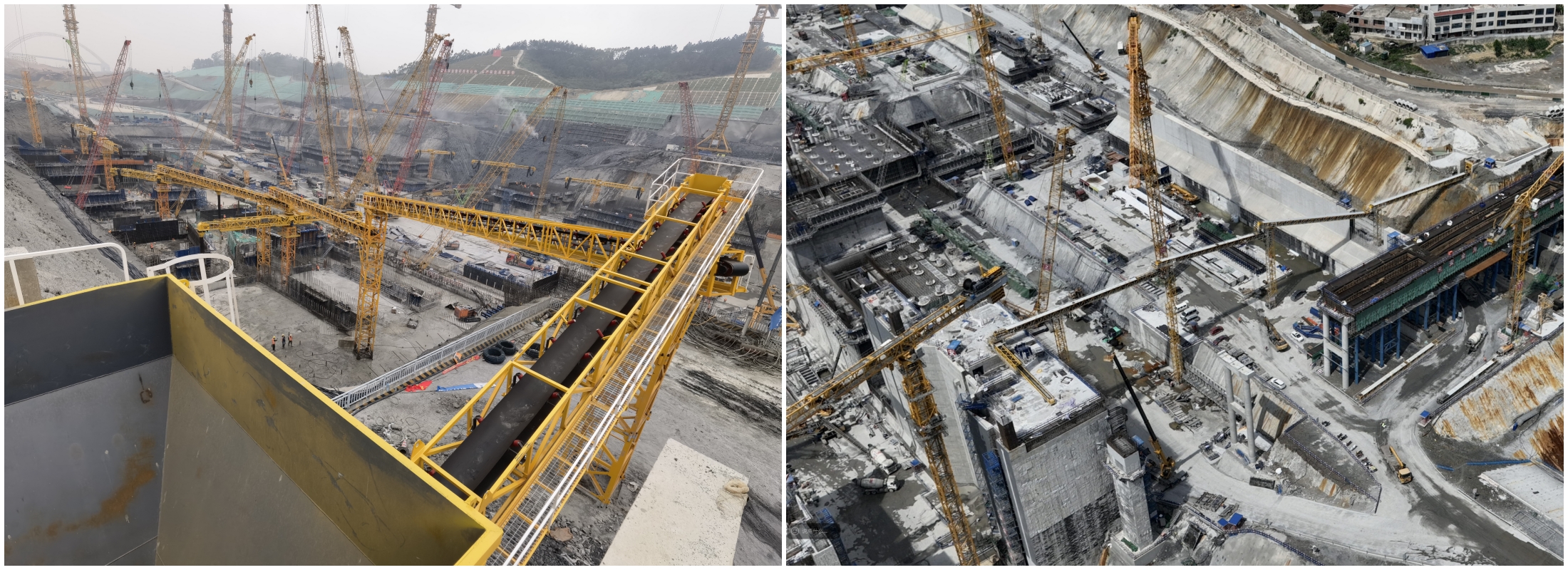 In light of the complex site conditions, a systematic solution for the installation, wiring, and synchronous lifting of mountain support columns was developed. A single-column multi-line structure for large-scale projects was developed to meet the installation requirements of the material supply line with minimal engineering work. This achieved high-reliability operation under conditions of cross-air erection, large-angle downward and upward movement, long-line synchronous lifting, and continuous operation for more than 200 hours in steep mountainous terrain. A high-efficiency concrete temperature and humidity protection structure system was also developed to strictly control the temperature rise of concrete exiting the machine.