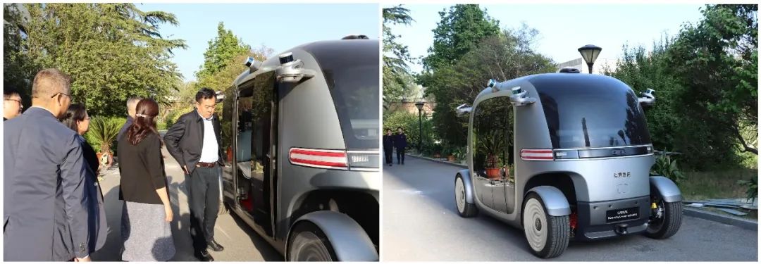 Researchers experience the company's regional smart driverless sightseeing shuttle bus on site.