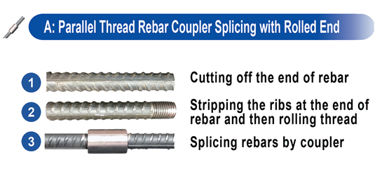 Rebar stripping and rolling parallel thread splicing technology is CABR’s patent. This rebar mechanical splice mode is very popular in China. CABR rebar parallel thread splcing system designed for the connection of concrete reinforcing bars from Φ12~Φ50mm. We also could producing rebar thread and coupler as your technical requirements.