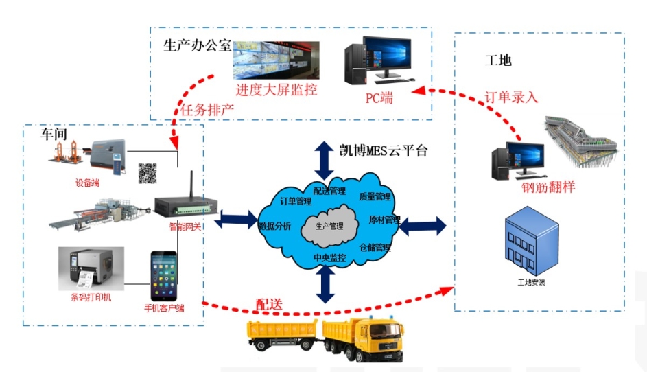 The steel bar processing management software system takes the material flow management in the steel bar processing process as the core, and realizes multi-project and multi-task remote order management with the help of industrial Internet, cloud services, intelligent equipment and other technical means, and realizes order scheduling, production order distribution, and production sign printing. , Finished products report for work, finished products in and out of the warehouse and other functions.