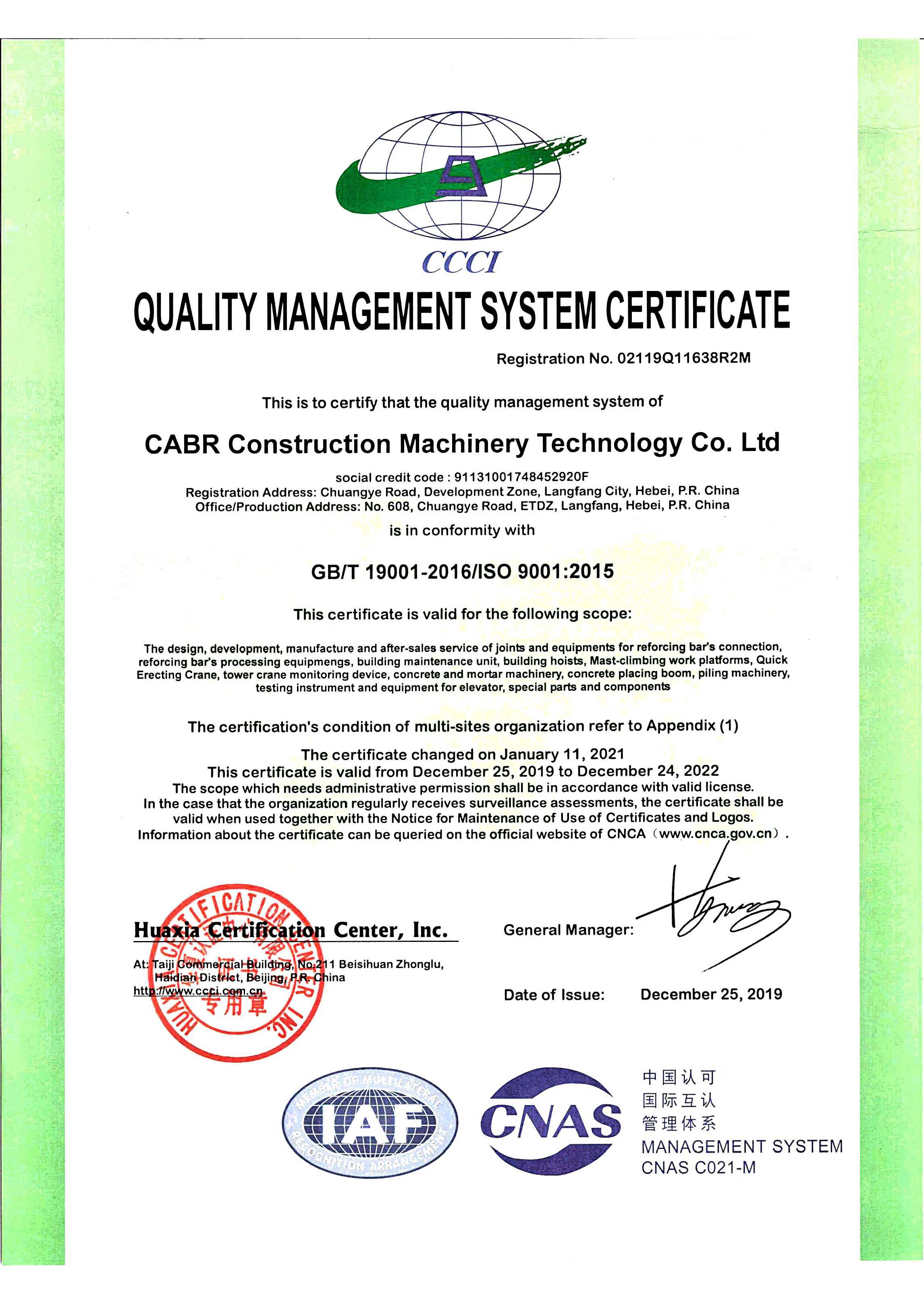 The scope of this quality system certification also includes items such as concrete placing boom, mast climbing work platform, self ercted tower crane, and multifunctional drilling rigs,etc.